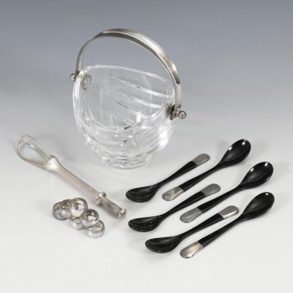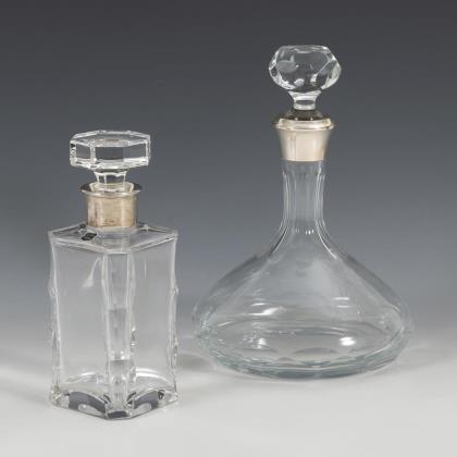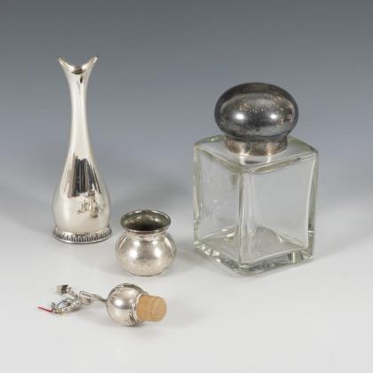 Großer Flacon mit Silberdeckel, schlanke Vase, Kugelväschen und figürlicher Flaschenverschluss mit Monogrammgravur "MCV"