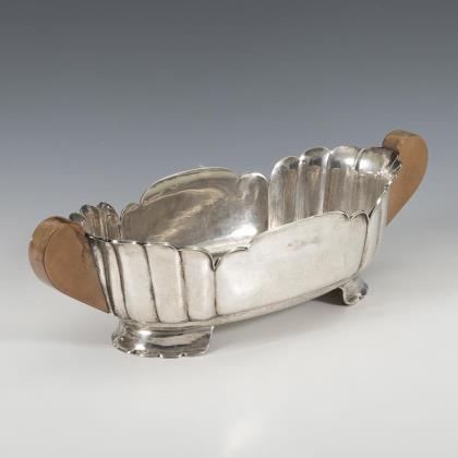 Ovale Schale mit fächerartig gegliederter Wandung und 2 Handhaben aus Holz