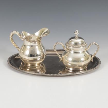 Massives Set mit oblongem Tablett, Sahnekännchen sowie Zuckerschale mit Scharnierhenkel