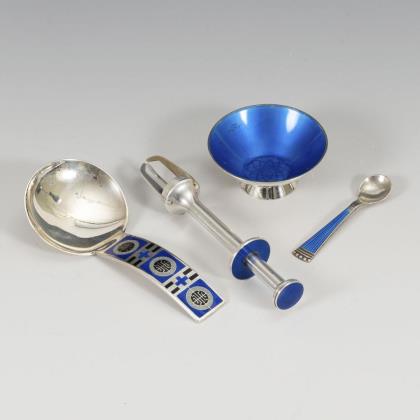 Speisegabel Georg Jensen, L 17 cm. Kleiner Heber und Sahnelöffel mit reliefierter Blüte am Griffende, L 12,5/15,5 cm