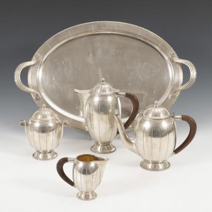 Bauchige Form mit linearem Dekor und Edelholz-Griffen: Kaffeekanne, Teekanne, Zuckerdose und Milchkännchen, auf ovalem Tablett