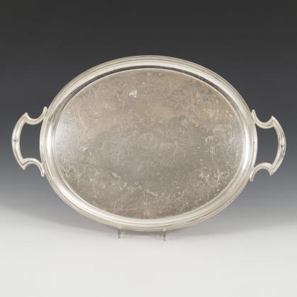 Schweres Tablett mit 2 Handhaben, umlaufender Rankengravur und zentralem Pelikanmotiv mit Krone