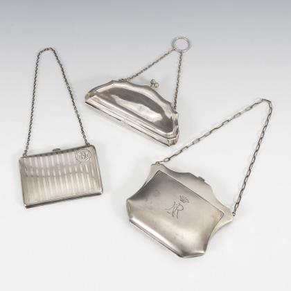 Verschiedene kleine Börsen bzw. Etuis an kurzer Kette, darunter 1x Jugendstil mit rosa Farbstein
