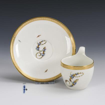 Campanertasse mit goldener Mäanderbordüre sowie dem goldgemalten und von Vergißmeinnicht umrankten Buchstaben "G"