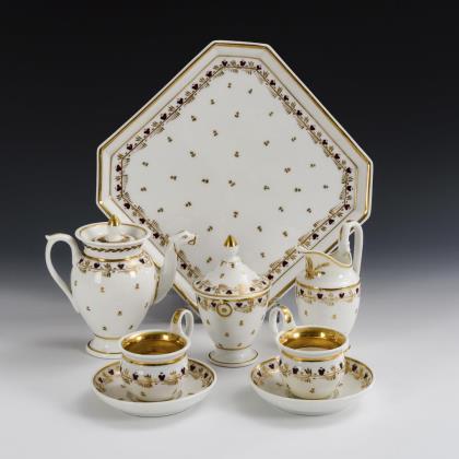 8 Teile. Mit gold-bordeauxfarbener, stilisierter Floralmalerei. Kaffeekanne (H 16 c), Milchkännchen (H 15 cm), Zuckerdose (H 14,5 cm), 2 Tassen, 2 Untertassen und quadratisches Tablett (27,5 x 27,5 cm)