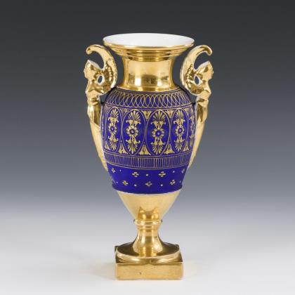 Ovoider Korpus mit Kraterhals, zwei Harpyienhandhaben und Rundfuß, auf Quadrathplinthe. Mattblauer Fond mit ornamentaler Goldmalerei, Goldfond