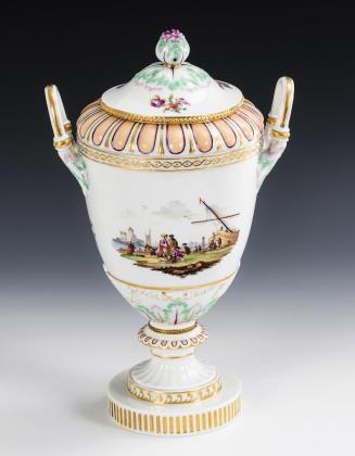 Ovoider Korpus mit Blatt- und Zungenbandrelief, zwei Henkeln, Knospenknaufdeckel und Rundfuß, auf kannelierter Plinthe. Beidseitig die Darstellung einer Hafenansicht mit Kaufleuten
