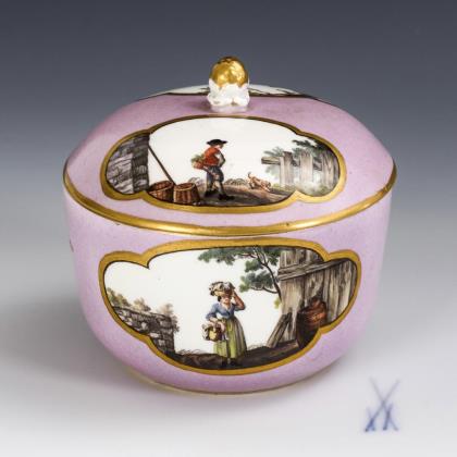 Zylinderdose mit Blütenknaufdeckel. Violetter Fond. In goldgerahmten Vierpasskartuschen die Darstellung von Bäuerinnen und Bauern