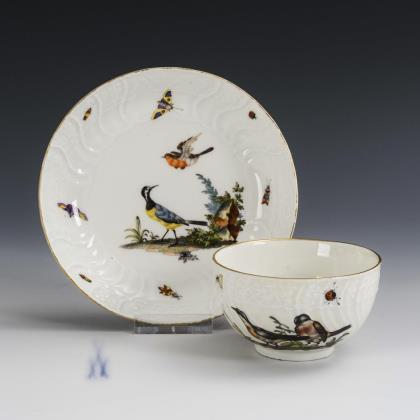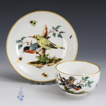 Form "Neubrandenstein". Bauchige Tasse mit Asthenkel. Auf Tasse und Untertasse die Darstellung kleiner Landschaftsinseln mit Vögeln, umgeben von Insekten