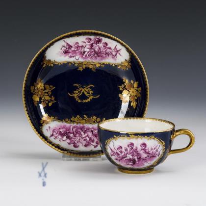 Bauchige Tasse mit Asthenkel. Kobaltblauer Fond mit goldener Blumenmalerei, in Ovalkartuschen sowie im Boden der Tasse purpurfarben gemalte Puttenszenen