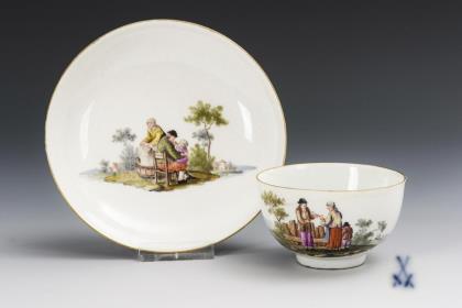 Bauchige Tasse mit Ohrenhenkel. Schauseitig die Darstellung eines Landschaftsstückes mit Bauernfamilie, im Spiegel der Untertasse die Darstellung einer wäschewaschenden Bäuerin sowie des Bauern mit Kind auf dem Schoß