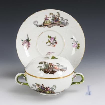 Kleine Terrine mit Rocaillerelief, Rocaillehenkeln mit Blütenbelag, Blütenknaufdeckel und Unterteller. Mit verschiedenen Watteau-Szenen, u.a. mit Wahrsagerin, Tänzerin und Harlekin