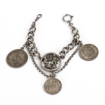 An der Kette mit Karabiner und Ringschließe zentrales Relief mit tanzendem Paar sowie Begleitkette und abgehängte Münzen (Nachprägung 1 Taler Österreich Erzherzog Leopold V. 1632 / König Ludwig II. von Bayern, Friedensschluss 1871 / 5 Mark Deutsches Reich Ludwig II. Bayern 1876)