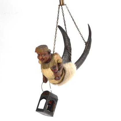 In der Art der Lüsterweibchen humorvoll gestalteter Kellermeister mit Kelch und Laterne; dabei seine Beine aus Ziegenhörnern gestaltet
