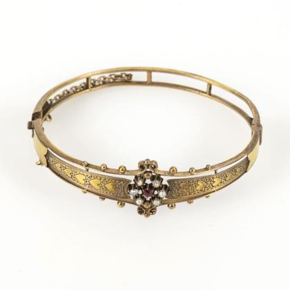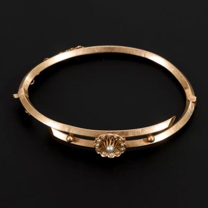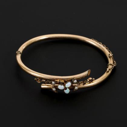 Klappreif mit schauseitig 3 Opalcabochons und 4 Halbperlchen. Kastenschloss mit Sicherheitskette