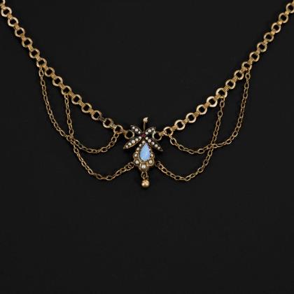 Collier mit kleinem Opalcabochon und Saatperlchen zwischen Kettenabhängungen, an Ankerkette mit Steckschließe