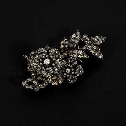 Zierschleife mit Altschliff-Diamanten und kleinen Rubincarrés an langer Nadel
