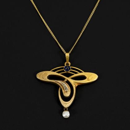 Stiltypischer Anhänger mit Saphircabochon, 4 kleinen Diamantrosen und abgehängtem Perlchen. Zarte Panzerkette mit Kastenschloss