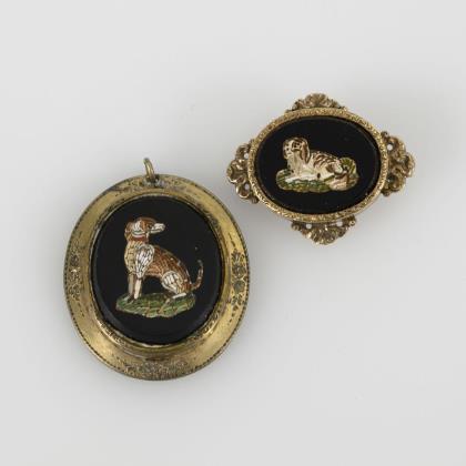3 in Hohlform gearbeitete Reliefbroschen mit Montierungen und partiellem Email. Ergänzte Kugelhaken. C-Haken. Öse