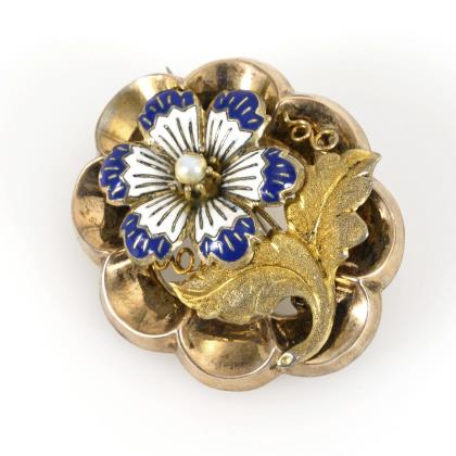 In Hohlform gearbeitete Reliefbrosche mit montierter, teilemaillierter Blume. C-Haken