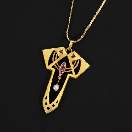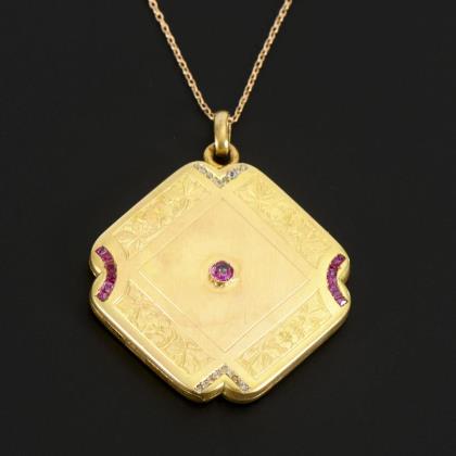 Großer, partiell gravierter Anhänger mit kleinen, eingelassenen Rubinen und Dimantrosen. 2 gerahmte Innenfächer. Ankerkette mit Ringfederschließe