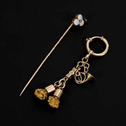 Ringfederschließe mit 2 abgehängten, kleinen Geweihstücken und Jagdhorn. Nadelkopf mit 3 Opalcabochons an langer Nadel