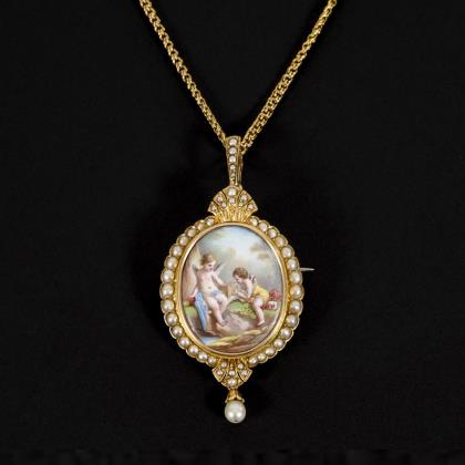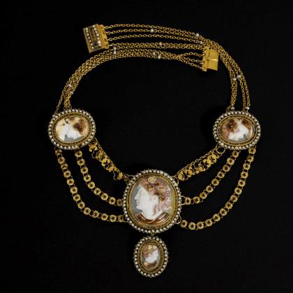 4 zargengefasste Kameen mit antikisierend geschnittenen Bacchanten-Profilköpfen, umgeben von blau emaillierten Rändern und aufgezogenen Perlchen, zwischen Zierglieder- und Ankerketten, an perlchenbesetzter und partiell emaillierter Kastenschließe