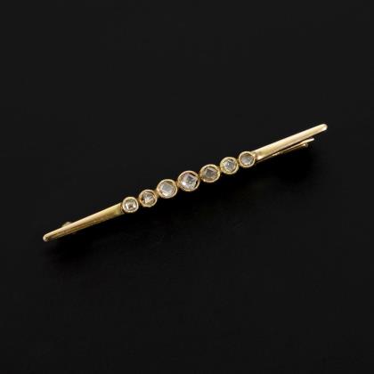 7 kleine, zargengefasste Diamanten zwischen schmalem Steg. Einfacher Haken