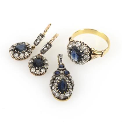 Entourage-Schmuckset mit Saphiren und Altschliff-Diamanten Ende 19. Jh.