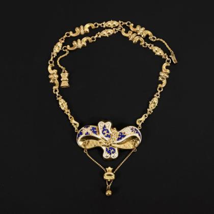In Hohlform gearbeitete Reliefglieder. Schauteil mit blau/weißem Email und Kettenabhängung. Kastenschloss