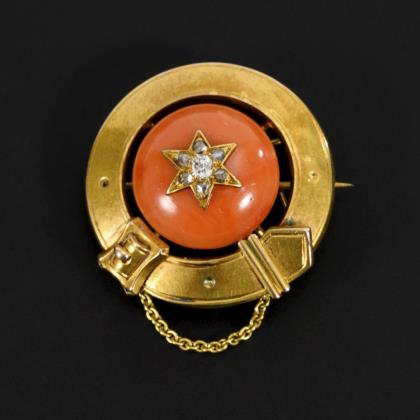 Große Korallenlinse mit 7 Altschliff-Diamanten in reliefiertem Gürtelrahmen. C-Haken, Abhängehaken und Sicherheitskette mit Nadel