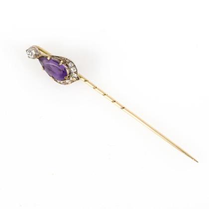 Krawattennadel mit Amethyst und Altschliff-Diamanten um 1900, im Etui.