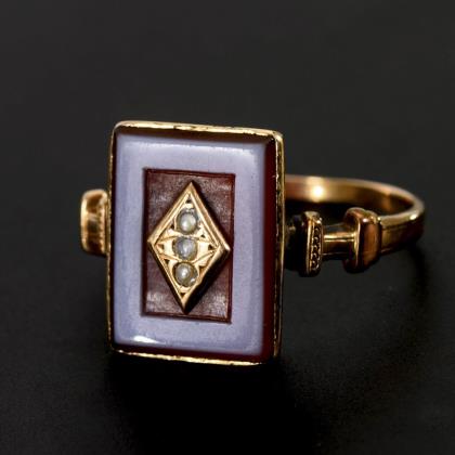 Zargengefasster Sard-Onyx mit 3 Saatperlchen, zwischen schmaler Schiene