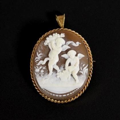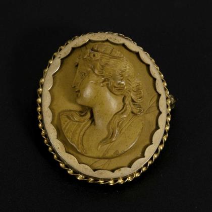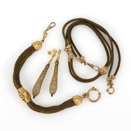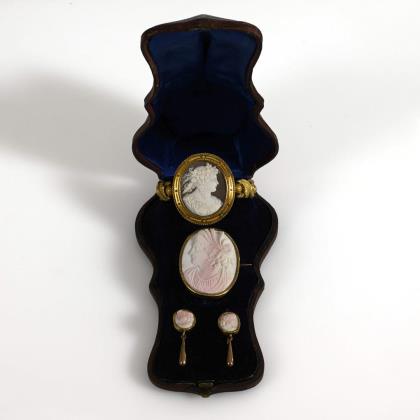 In Hohlform gestalteter Reliefarmreif. Mittig große Muschelkamee mit antikisierend geschnittenem Frauenprofilkopf in Zargenfassung, mit verziertem Rahmen. Kastenschloss mit Sicherheitskette. Brosche mit großer Korallenkamee mit antikisierend geschnittenem Frauenprofilkopf in Zargenfassung. C-Haken. Dazu passende Ohrringe mit Korallenkameen und Abhängungen. Einhängehaken