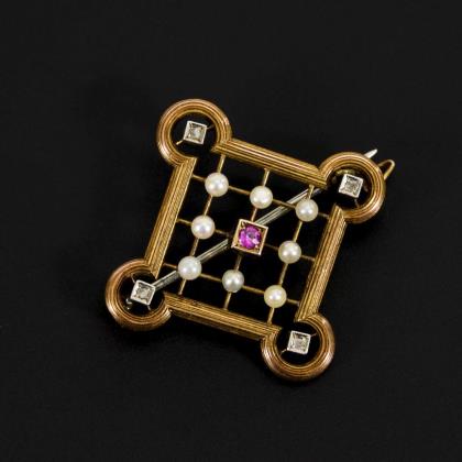 4-passige Brosche mit Farbstein, 8 Saatperlchen und 4 kleinen Diamantrosen. C-Haken