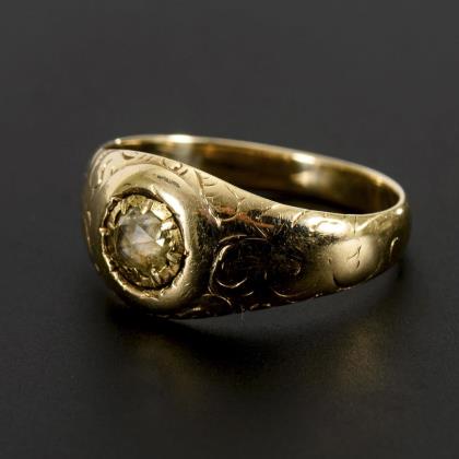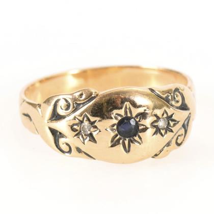 Mittig reliefierter Bandring mit kleinem eingelassenen Saphir und 2 Kleinstdiamanten