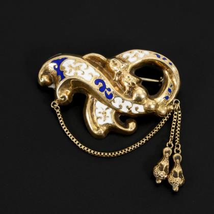 In Hohlform gearbeitete, rückseitig geschlossene Schleifenbrosche mit partiellem Email. Ergänzter Schiebehaken