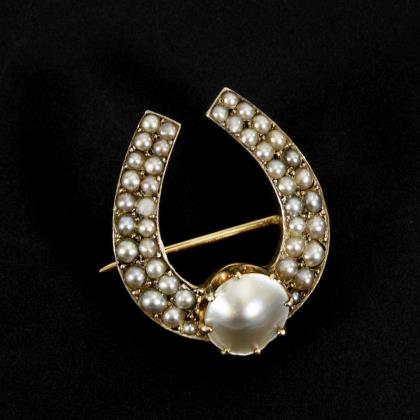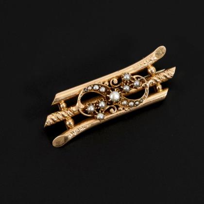 Brosche mit krappengefasster Perlmutteinlage und 40 einglassenen Halbperlchen. C-Haken
