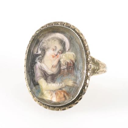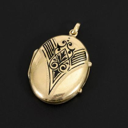Ovaler, emaillierter Klappreif mit schauseitig eingelassenen Perlchen zwischen Ornamentgravur. Kastenschloss mit Sicherheitskette