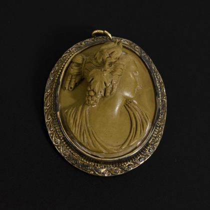 In Hohlform gearbeitete Reliefanhänger mit Montierung und geschlossener Rückseite. Einhängehaken