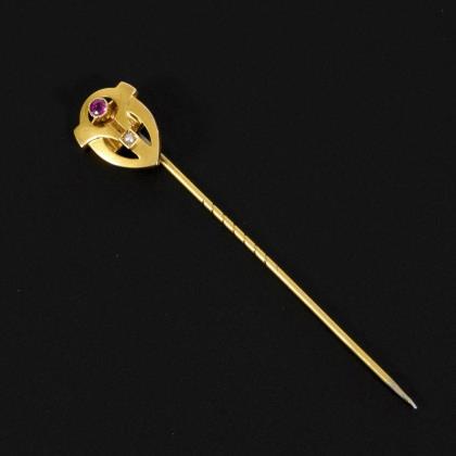 Krawattennadel mit Altschliff-Diamanten und Rubinen Ende 19. Jh., im Originaletui "Pablo Beiner SAN SEBASTIAN" .