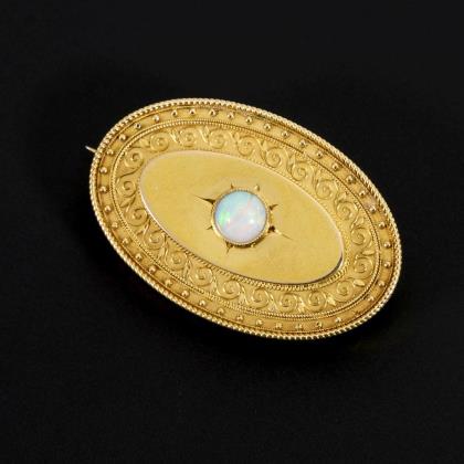Stiltypische Brosche mit Fensteremail und 2 kleinen Opalcabochons. Nadel mit kleiner Perle auf stilisiertem Blatt. C-Haken