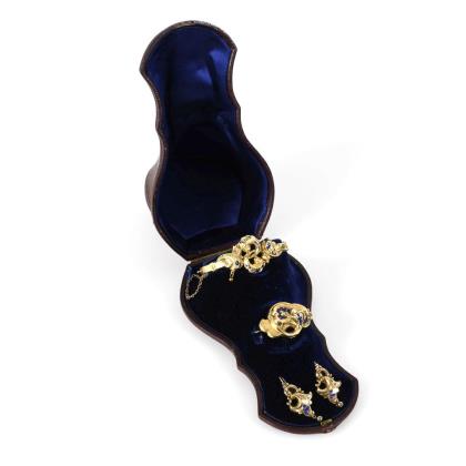 Biedermeier-Demi-Parure mit Email, im Originaletui.