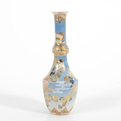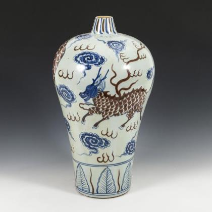 Vasen mit schlankem Hals. Auf dem blauen Untergrund begegnen sich Luft- und Wasserdrachen. Innenwandung teilweise hellblau emailliert