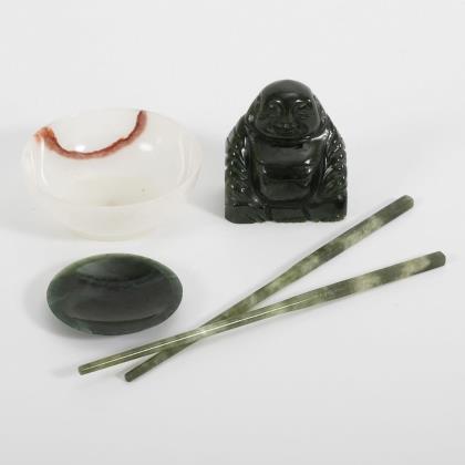 Weißes Schüsselchen aus Achat, Ø 10 cm. Tellerchen, zwei Eßstäbchen und Figur aus grüner Jade. Hotei H 7,5 cm