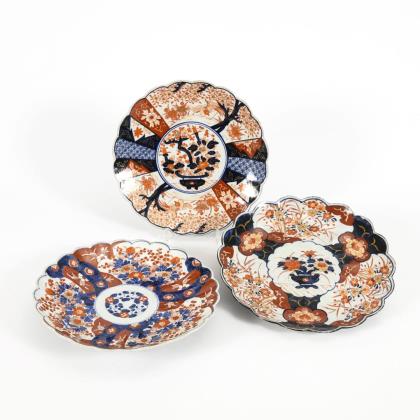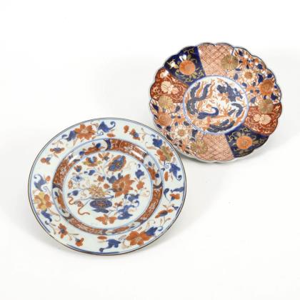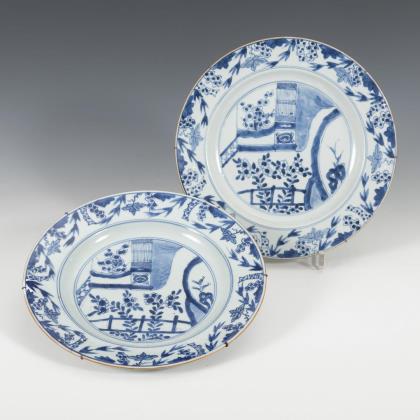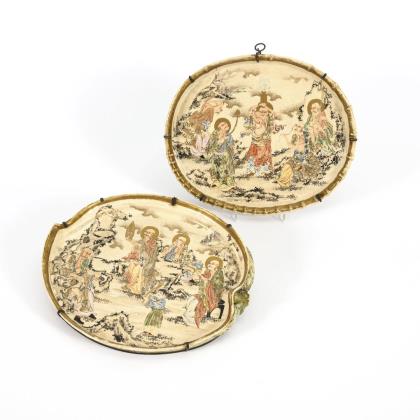 In der Art der Satsumaware. Beide mit vielfigurigen Heiligendarstellungen in angedeuteter Landschaft. Einmal entspricht die Randform des Tabletts einem Pfirsich mit plastischen Blättern und Stiel. Bei dem anderen Stück ist der Rand als Bambus geformt. Unglasierte Unterseite leicht unregelmäßig, wie mit Fingern flach gedrückt. Beide mit Wandhalterungen