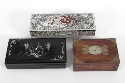 Rechteckiges Kästchen mit Rankenmuster und fliegenden Reihern als Perlmuttintarsien. Innen wurden die changierenden Teile der Pauamuschel verarbeitet. 23 x 8 x 4 cm. / Rechteckiges Lackkästchen mit Schmetterlingen und Blüten als Perlmuttintarsien, 5 x 20 x 10 cm. / Rechteckiges Holzkästchen mit Jadeeinlage und Fledermaus-Messingbeschlägen, 6 x 14,5 x 10 cm