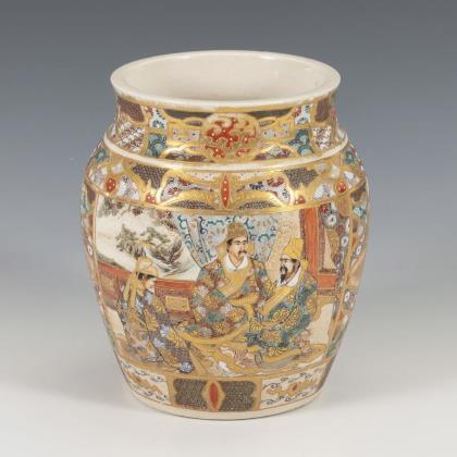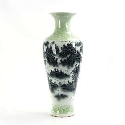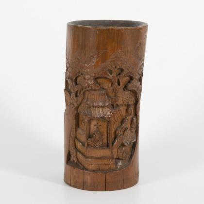 Zylindrische Form mit kunstvoll und tief reliefierter Wandung. Männer im Bambushain und Pagode in den Bergen