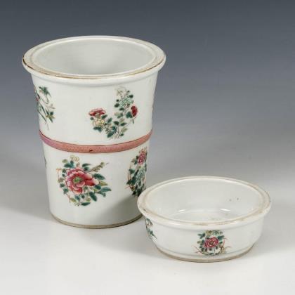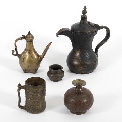 Kanne mit Scharnierdeckel und extra verschließbarer Tülle, starke Alterspatina, nur auf Deckel schmaler Dekorstreifen. / Schweres Kännchen auf vier Füßchen mit Scharnierdeckel und langer Tülle. / Aus starkem Blech gefertigter zylindrischer Becher mit aufgelöteten Musterbändern und einem nachträglich angebrachten Messingetikett mit Sanskrit?schriftzeichen. Am Boden eventuell verschliffene Marke. / Gedrungene Kugelvase mit feinem floralem Ornament, auf roter glänzender Emaillierung. / Kleines Töpfchen mit gepunzter Wandung
