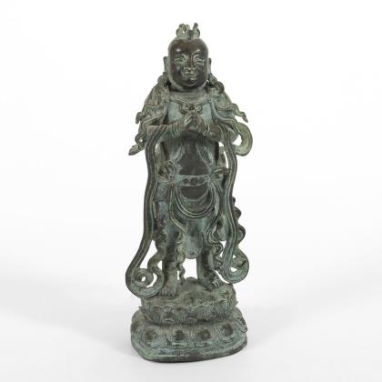 Auf doppeltem Lotosthron stehende Figur mit aneinandergelegten Händen. Durch Bänder und "wehende" Rockschöße dynamische Wirkung